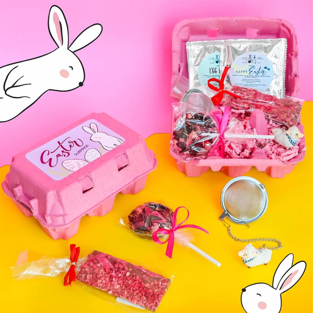 Easter Surprise (np. wersja pink) łączy herbaty (Happy Easter, Egg Hunt), słodki dodatek i zaparzacz — czyli ma balans: prezent wygląda „bogato”, ale nadal jest użyteczny.