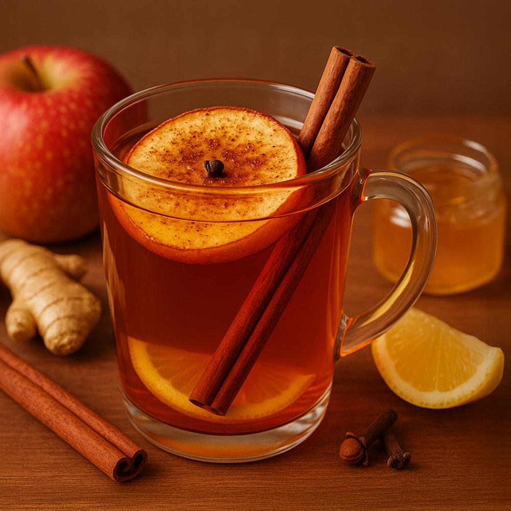 Złóż napój: Do kubka wlej zaparzoną herbatę, dodaj sok z cytryny, goździk i – opcjonalnie – miód. Na wierzchu ułóż karmelizowany plaster jabłka.