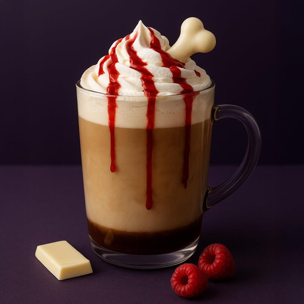 Jeszcze nigdy kawa nie wyglądała tak strasznie dobrze! Połączenie aromatycznego espresso, czekolady i bitej śmietany, oblanej syropem malinowym, daje efekt krwawej mgły na Twoim kubku.